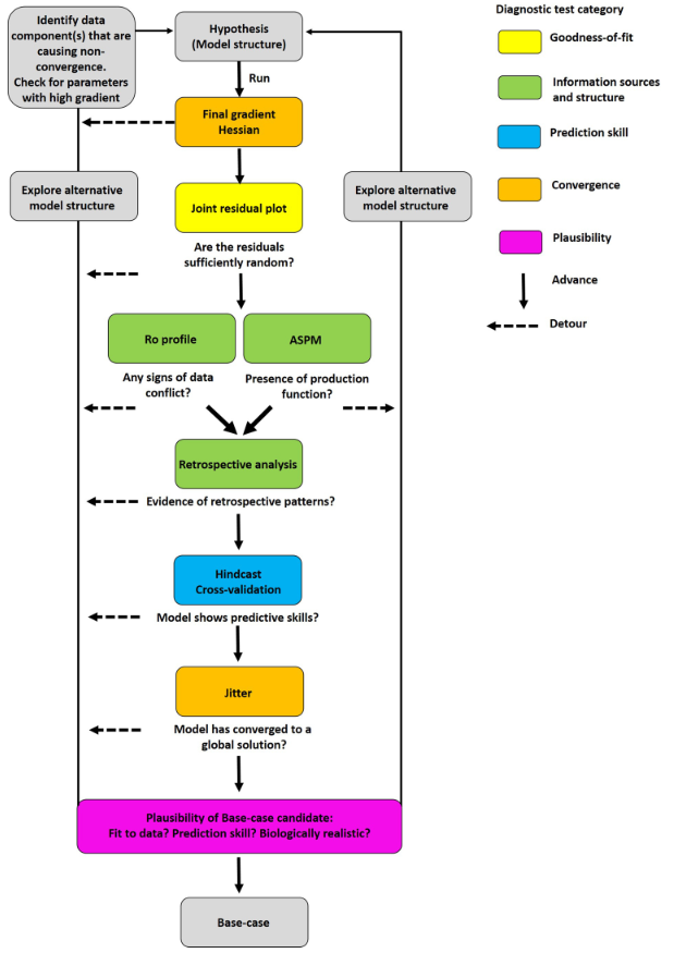 Carvalho, F., Winker, H., Courtney, D., Kapur, M., Kell, L., Cardinale, M., Schirripa, M., Kitakado, T., Yemane, D., Piner, K.R., Maunder, M.N., Taylor, I., Wetzel, C.R., Doering, K., Johnson, K.F., and Methot, R.D. 2021. A cookbook for using model diagnostics in integrated stock assessments. Fisheries Research